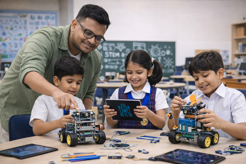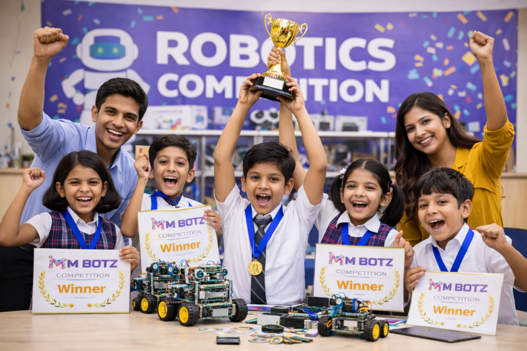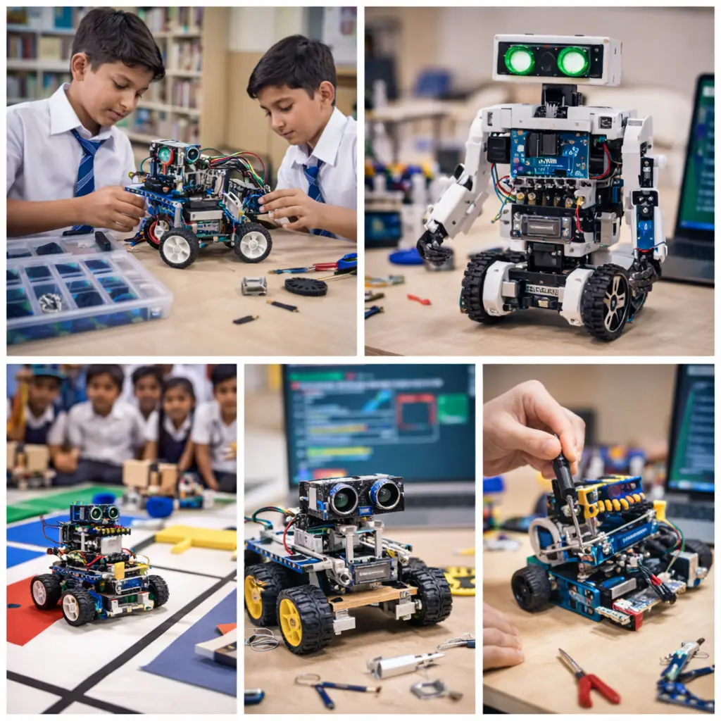 A small wheeled robot lies on a map, displaying its circuitry and battery pack. Next to the robot, there is a small potted plant with spiky leaves. The background features a partially visible word 'ROBOT' spelled out in block letters.
